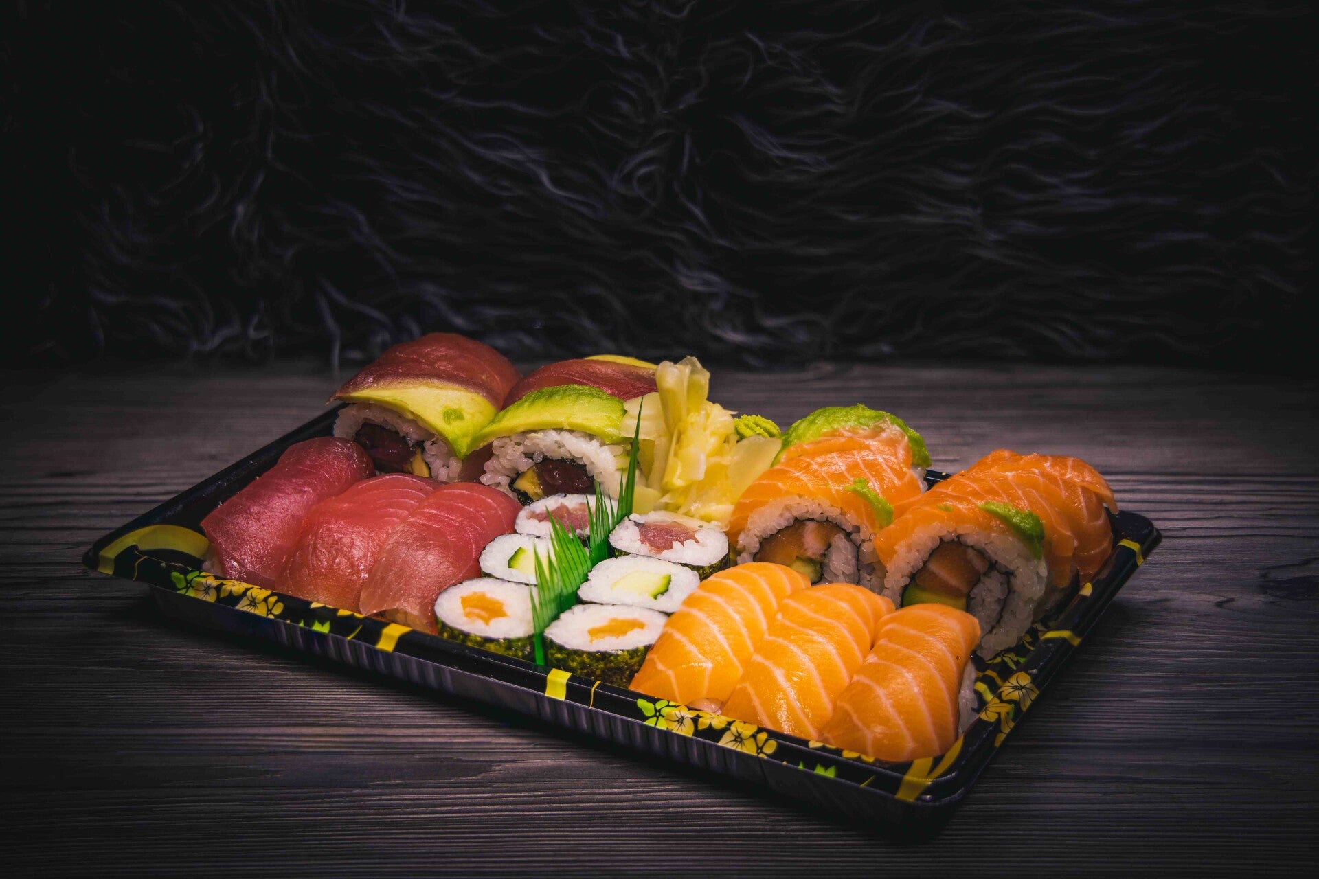 Serviert mit Rainbow Thuna (4 Stück), Rainbow Lachs (4 Stück), Nigiri Tuna (3 Stück), Lachs Nigiri (3 Stück) und gemischte Maki (6 Stück)