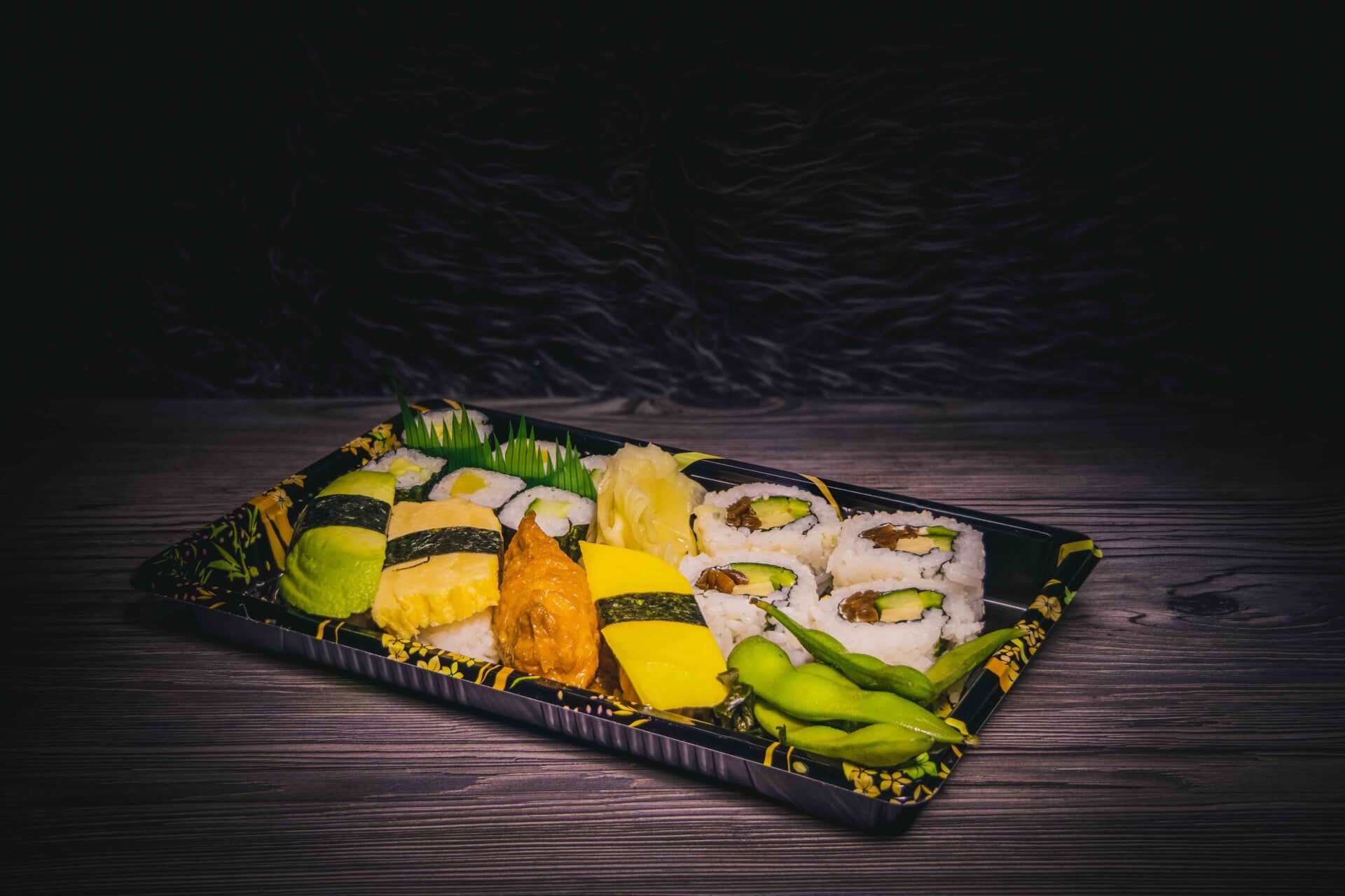 Serviert mit Vegi Ura Maki (4 Stück), Nigiri (4 Stück) und Maki (6 Stück)