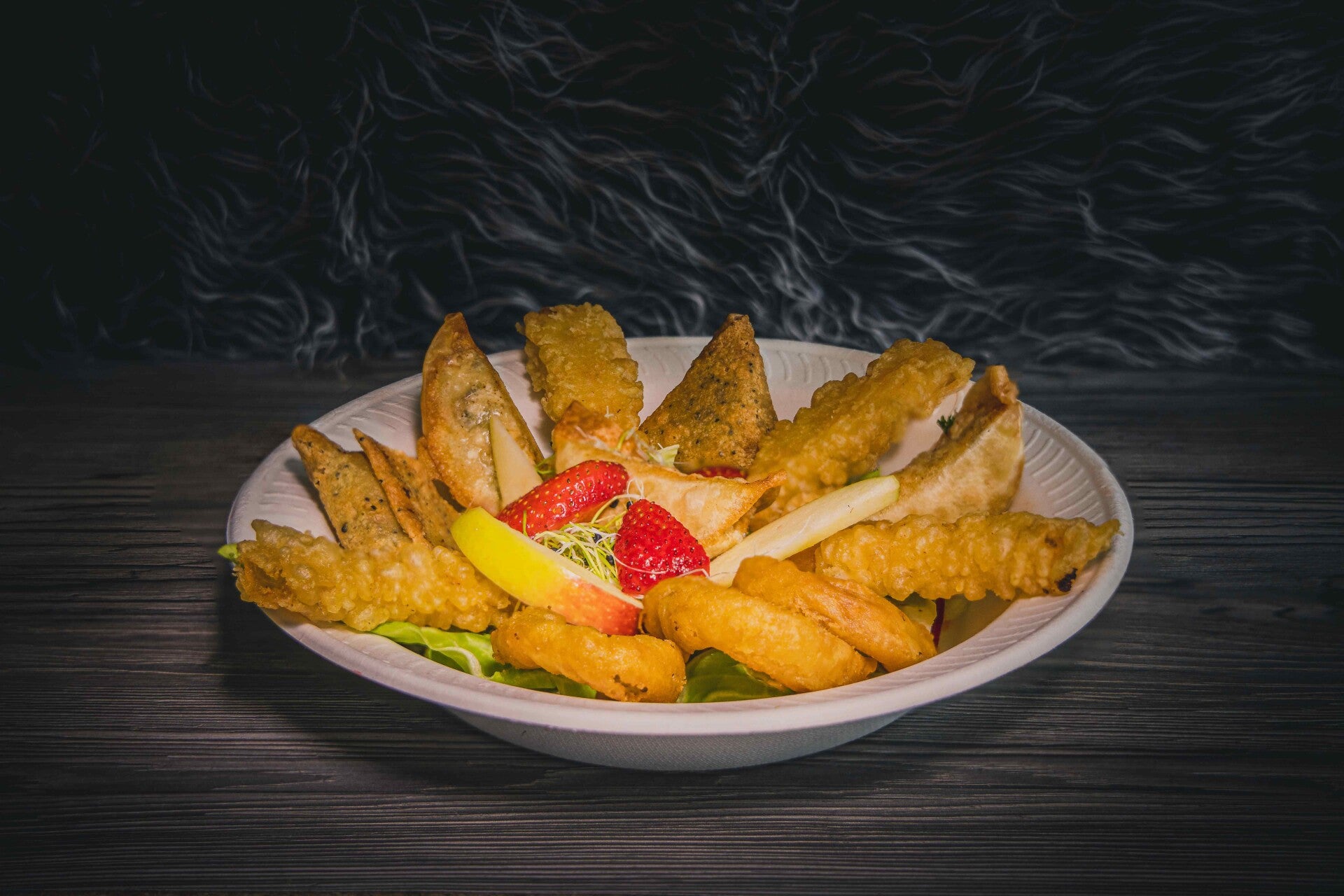 4 Calamari Rings, 2 Samosa, 2 Poulet-Gyoza, 2 Tempura-Crevetten,